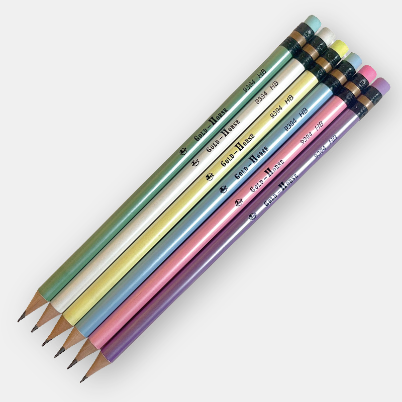 HB ROUND PENCIL,PEARL POWDER LACQUERED, 6 ASSORTED COLORS, W/ERASER.