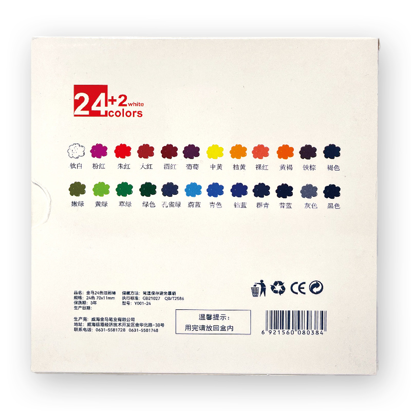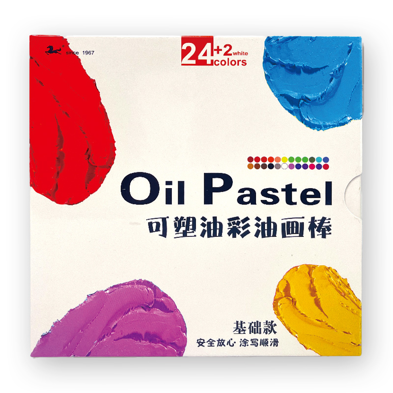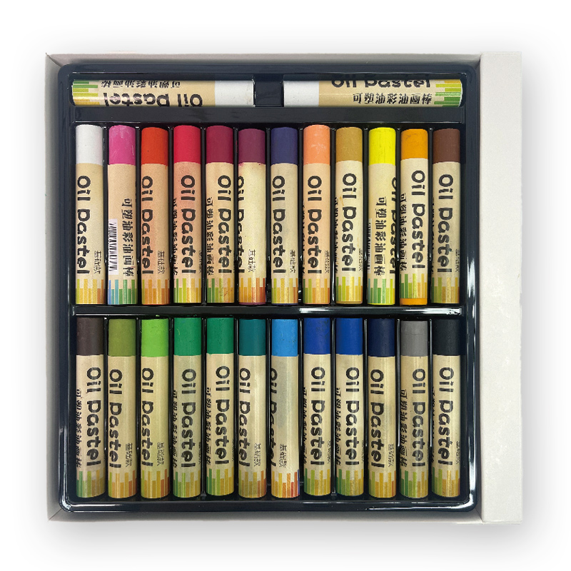 -Standard oil pastels in 24 colors plus 2 extra white colors.-24 pastels in a box with plastic tray and transparent protective cover.